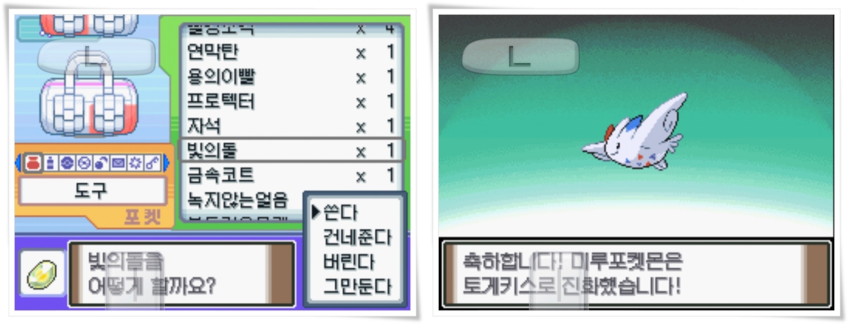 회복 후 빛의 돌로 토게틱을 토게키스로 진화시키는 것도 완료했습니다.